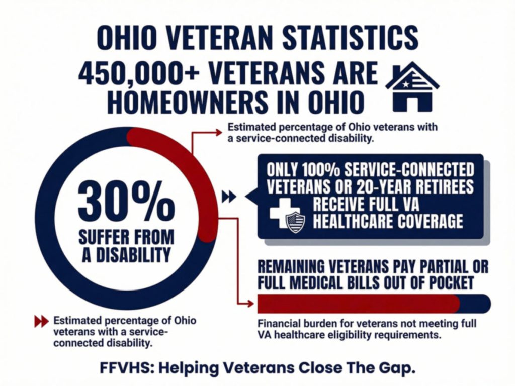 The 2020 Ohio State Census Bureau has over 450,000 Veterans that are homeowners. 30% of them suffer from a disability. Many people believe if you are a Veteran your Health Care is paid 100%. That is not true, unless your injuries or illnesses are rated 100% service connected or the Veteran completed 20 years of service and retired with a Honorable Discharge. This leaves many Veterans and Families who sacrifice their lives to pay portion or all their medical bills. FFVHS is trying to bring awareness to the community that not every Veteran is receiving 100% support from the VA and the families need help closing the gap.